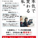 志学塾 新中1・2年クラス 塾生大募集 一月も後半になり受験も近づいてきました。 今になって『どうしよう成績が伸びない』と悩んでも仕方ありません。 今の成績は3カ月前にどれだけ勉強していたかを表しています。 成績が足りないのであれば方法は一… [続きを読む]